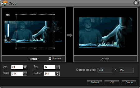 Click 'Crop' button to the interface. Drag the selection box to select output area that your want.