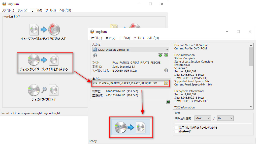 ステップ2、PCに挿入されているDVDディスクは自動検出されます。「出力先」でイメージファイルの保存先を指定します。