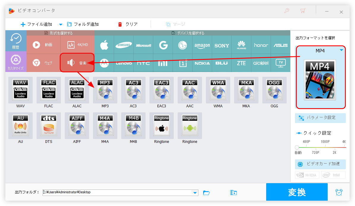 右側の形式アイコンを押して、「音楽」カテゴリから出力形式を選択します。