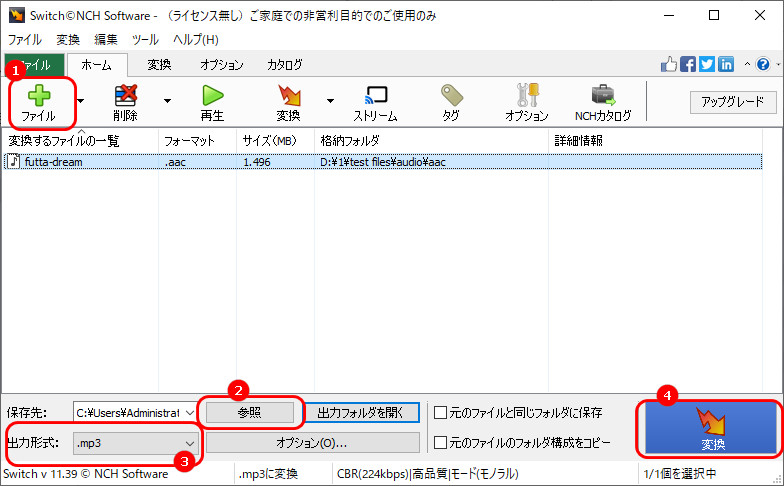 AAC MP3変換フリーソフト「Switch MP3変換ソフト」の利用手順: