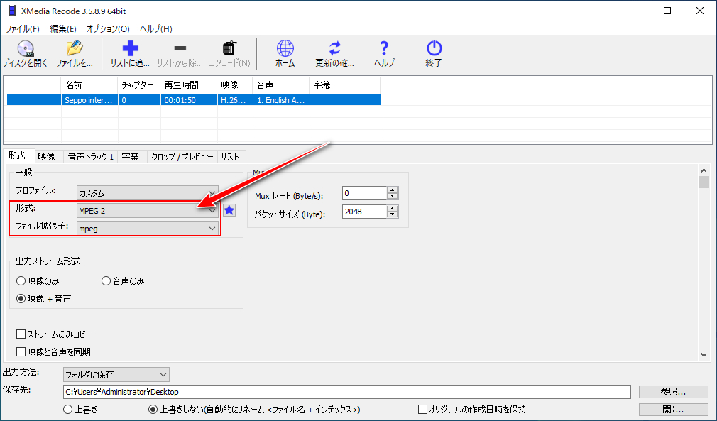 ⑦「MPEGバージョン」オプションをMPEG-1またはMPEG-2に設定します。