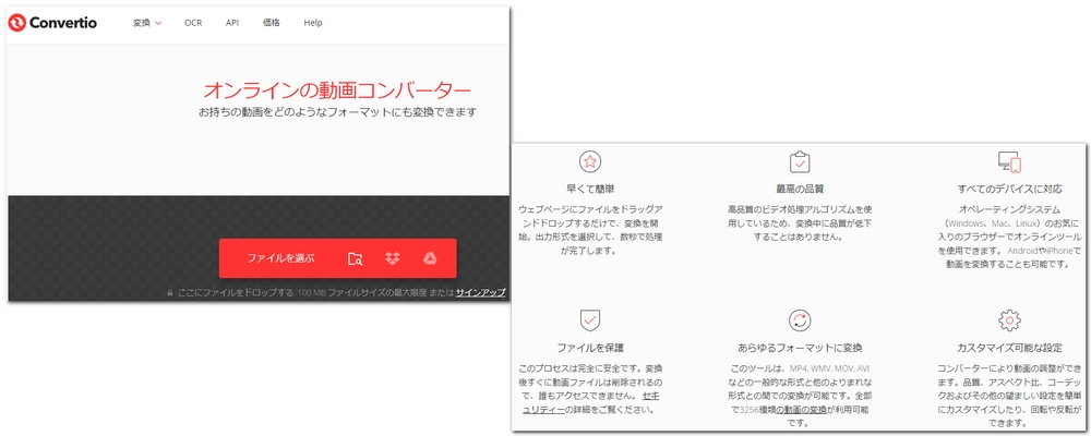 Convertioはオンラインで利用できる便利なコンバーターで、300以上のフォーマットに対応しており、ビデオ、オーディオ、画像、文書など様々なファイルフォーマットをコンバートできます。ファイルをドラッグ&ドロップするだけでコンバートが可能であるため、初心者でも簡単に利用できます。Google DriveやDropboxから直接ファイルをアップロードしてコンバートできます。