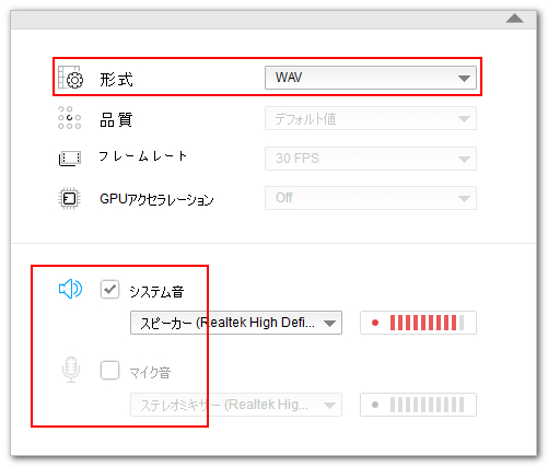 「形式」ドロップダウンリストから録音データの保存形式を選択します。WAVをおすすめします。