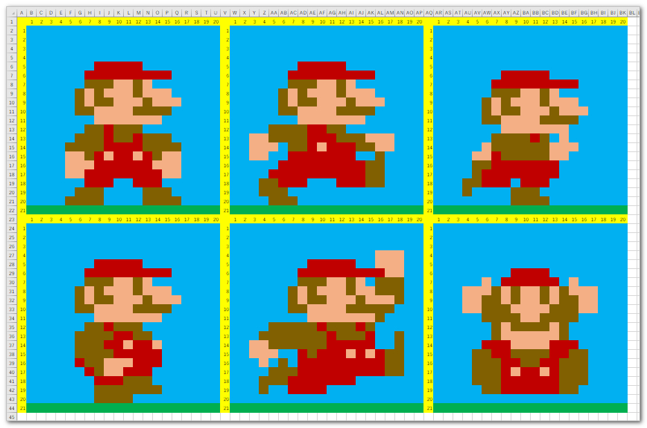 エクセルのセルを正方形にして違う背景色を追加すれば、専門的なツールを使わなくてもドット絵を作ることができます。例えば、下記のようなマリオの6種類の基本ポーズを書くことができます。