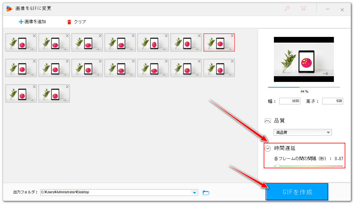 Step3:画面右側のサムネイルをクリックして出力のプレビューを確認できますので、それを見ながら適切な時間遅延を設定します。必要あれば、GIFの解像度と品質を調整できます。