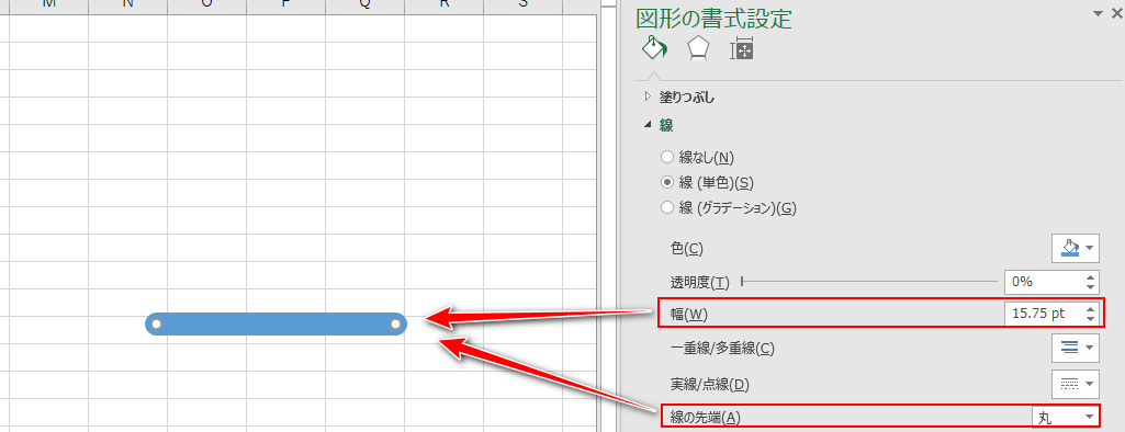 Step2、直線を選択した状態で「書式」タブから「図形の枠線」>>「太さ」>>「その他の線」をクリックし、「図形の書式設定」パネルを呼び出します。「幅」オプションで直線の太さを設定します。また、「線の先端」オプションを「丸」に設定します。