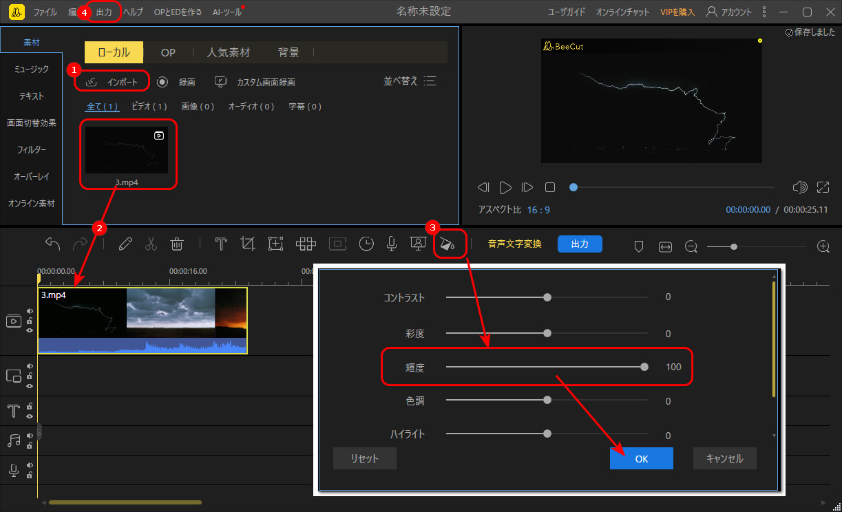 「出力設定」で「明るさ」などの項目を調整し、真っ暗な動画を明るくします。