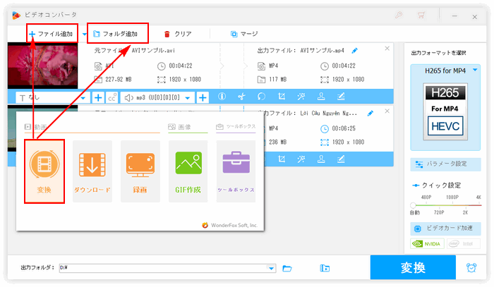 WonderFox HD Video Converter Factory Proを立ち上げ、最初の画面で「変換」機能を選択します。次に「ファイル追加」もしくは「フォルダ追加」ボタンをクリックして1080Pから720Pに変換したい動画ファイルを一括で読み込みます。