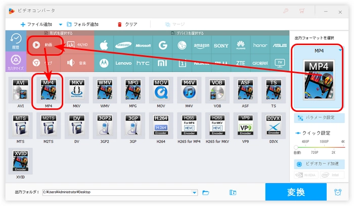 画面右側の形式アイコンをクリックして、必要な出力形式を選択します。ここでは、「動画」カテゴリの「MP4」を選択します。