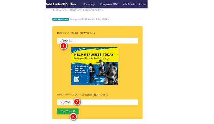 ステップ1、「ブラウズ」を押して、動画とMP3を追加した後、「アップロード」を押します。動画ファイルのサイズによって、数秒から数分でアップロードできます。