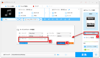 「パラメータ設定」ボタンをクリックし、「オーディオパラメータの設定」項目に移動します。「ボリューム」のスライダーを左右に動かすことで、音声ファイルの音量を調整できます。音量は0%~200%の範囲内で調整可能です。音量調整が完了したら、「OK」をクリックして設定を保存してください。