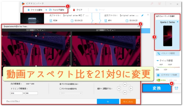 ③右下の「変換」ボタンをクリックし、動画・映画のアスペクト比を21対9に変更する