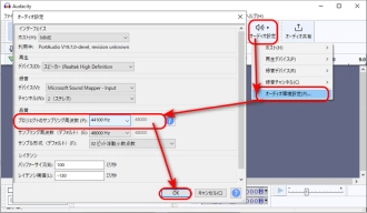 1.Audacityメイン画面で「オーディオ設定」>「オーディオ環境設定」をクリックします。