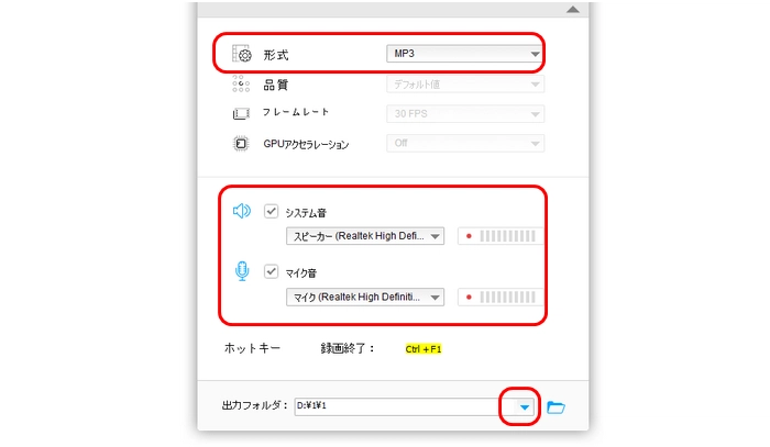 「出力フォルダ」欄の右端にある逆三角形をクリックして、録音ファイルの保存先を指定します。