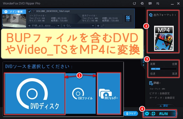 著作権保護技術が施されているDVD及びDVDフォルダなどを変換・リッピングするという行為は現在日本では違法です。WonderFoxはいかなる違法行為を禁じております。本文で紹介するBUPからMP4への変換方法は、個人利用に限られています。