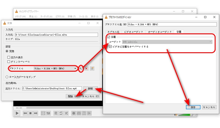 ステップ5.スパナアイコンをクリックして、「プロファイルのエディジョン」画面を開きます。「字幕」タブに移動し、「字幕」にチェックを入れて、「コーデック」を「DVD Subtitle」に変更します。そして、「ビデオに字幕をオーバーレイする」にチェックを入れて、「保存」をクリックして、前の画面に戻します。