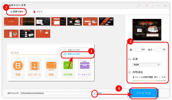 ④GIFの出力フォルダを設定して、「GIFを作成」をクリックします。