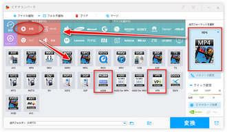 Step2.画面右側のフォーマットアイコンをクリックします。出力フォーマットリストの「動画」タブでH264・MPEG4・VP9をサポートする形式(MP4、AVI、MKVなど)を指定するか、直接「H264」または「VP9」を指定します。