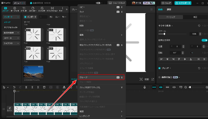 3映像トラック上で全ての画像を選択した状態でマウスを右クリックし、「グループ」を選択します。