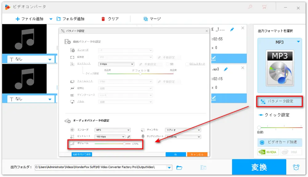 WonderFox HD Video Converter Factory Proは使いやすい音量調整ソフトです。ほぼすべての動画や音声形式に対応しています。このソフトには音量調整機能が搭載されています。簡単な操作だけで、音声の音量を最大200%まで上げることができます。このソフトにはバッチ処理モードが搭載されており、複数の音声ファイルの音量を一括で調整することができます。音量のほか、エンコーダ、ビットレート、チャンネル、サンプリングレートなどを簡単に調整することができます。