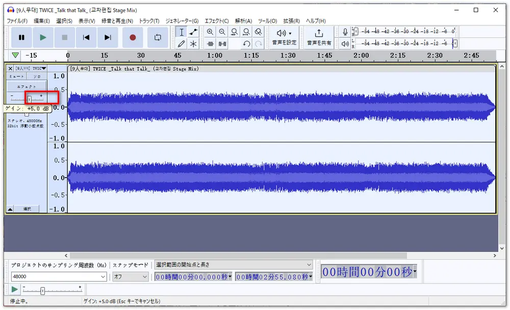 ステップ2、Audacityで音量を調整(上げる/下げる)する