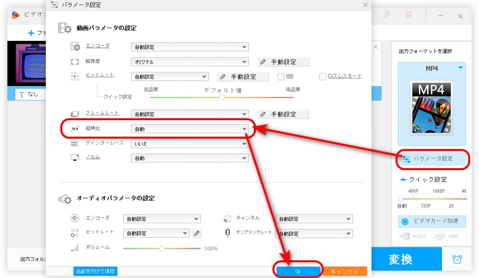 「パラメータ設定」をクリックして、「縦横比」ドロップダウンリストから必要なアスペクト比を選択します。「Ok」をクリックして設定を保存します。
