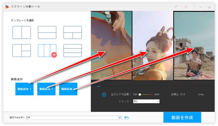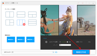 出力フォルダ欄の「▼」アイコンをクリックして出力先を設定します。最後に「動画を作成」ボタンをクリックして動画と動画を組み合わせるプロセスを始めます。
