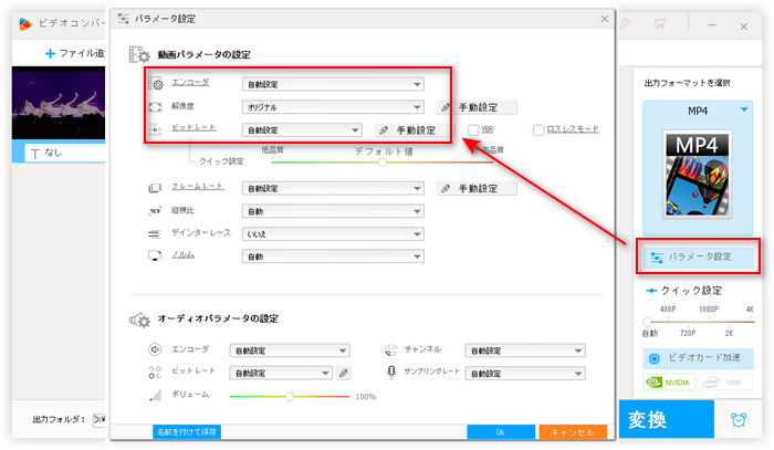 Step4.「パラメータ設定」ボタンをクリックします。表示された画面の「動画パラメータの設定」セクションで必要に応じて、動画のエンコーダ(コーデック)、解像度、ビットレートなどを変更します。