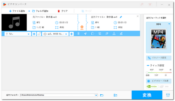 音声ファイルをそのまま動画形式に変換できるシンプルで手軽な方法です。動画のフレームレートや画質を調整できるので、短時間で動画化したいときに便利です。