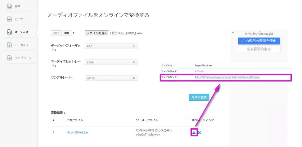 ・変換後、ダウンロードボタンをクリックして、次の画面に進んだら、ファイルリンクをクリックして、ファイルをダウンロードします