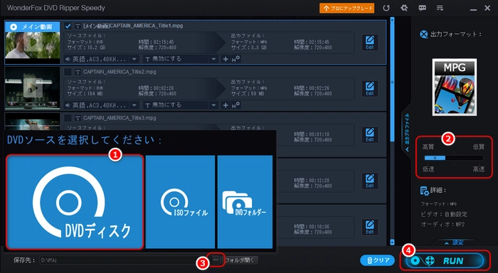 出力ファイルの保存先を指定し、「RUN」ボタンをクリックすると、コピーガードが解除されたDVDの内容が指定したフォーマットで保存されます。