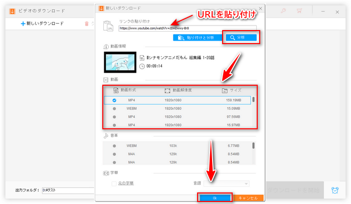 分析結果からお気に入りの動画形式・解像度・サイズを選択して、下の「OK」をクリックします。