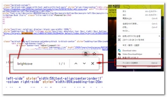 動画再生画面の周囲に「Share」ボタンがない場合、ページの何もないところで右クリックして「ページのソースを表示」を選択するか、「Ctrl+U」を同時に押すと、そのページのソースページが開きます。ソースページでは、「Ctrl+F」を同時に押して検索機能を開き、「brightcove」を入力し検索することで、Brightcove動画の実際のURLを見つけて、コピーしダウンロードすることができます。