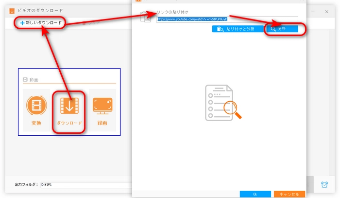 「ビデオのダウンロード」画面の下にある「出力フォルダ」欄で出力先を指定します。