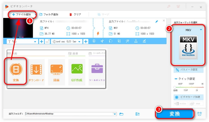 1.ソフトを起動し、「変換」>「+ファイル追加」の手順で動画や音楽を追加します。