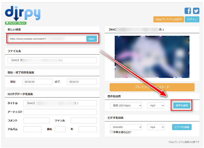 ステップ2、YouTube音楽のURLを貼り付けて「dirpy!」をクリックします。
