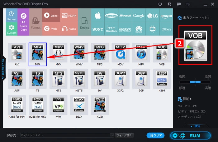 上記すべての設定が完了したら、ソフト下部の「保存先」欄の「…」ボタンをクリックしてMP4動画の保存先を設定します。次は「RUN」ボタンをクリックし、Windows10/11でDVDをMP4に無劣化で変換します。