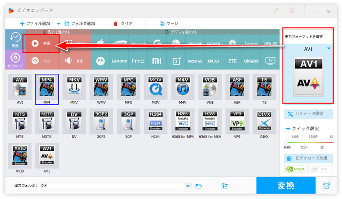 画面右側の形式アイコンをクリックして500以上の形式&プリセットから構成する出力形式リストを開き、「動画」カテゴリから必要な動画形式を選択します。また、「音楽」カテゴリからMP3等の音声形式を選択すれば、家族動画から音声を抽出して単独で保存することもできます。