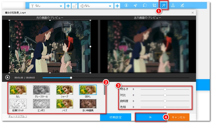 Windows10でエフェクト追加ツールを使ってMP4を編集するには、まずツールバーの「5番目のアイコン」をクリックして、エフェクト追加ツールを開きます。このツールを使ったら、MP4にぼかし/モザイク/古い映画風などのフィルターを追加したり、明るさ/対比/飽和度/色相を調整したりすることができます。ちなみに、MP4画面の一部にエフェクトを加えることもサポートされています。エフェクトを追加した後、「OK」をクリックして編集を保存します。
