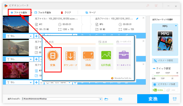 H265エンコードソフトWonderFox HD Video Converter Factory Proを実行し、5つのメイン機能から「変換」を選択します。次に「ファイル追加」または「フォルダ追加」をクリックしてH265で再エンコードしたい動画ファイルを一括で読み込みます。