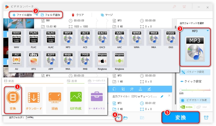 出力フォーマットの選択:画面右側の「出力フォーマットを選択」ボタンをクリックします。「音楽」カテゴリから、MP3、WAV、AAC、FLAC、M4A、OGGなど音声フォーマットを選びます。