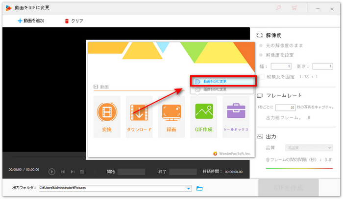 動画静止画切り出しソフトWonderFox HD Video Converter Factory Proを起動します。ソフトのメイン画面で「動画をGIFに変更」を選択し、「動画を追加」をクリックして、対象の動画をソフトに読み込みます。