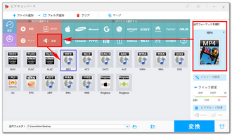 「出力フォーマットを選択」との文字の下にある形式アイコンをクリックして500以上のプリセットから構成する出力形式リストを開きます。動画からMP3を抽出するには「音楽」カテゴリに移動してMP3を出力形式として選択してください。もちろん、他の音声形式を選択してもオーケーです。