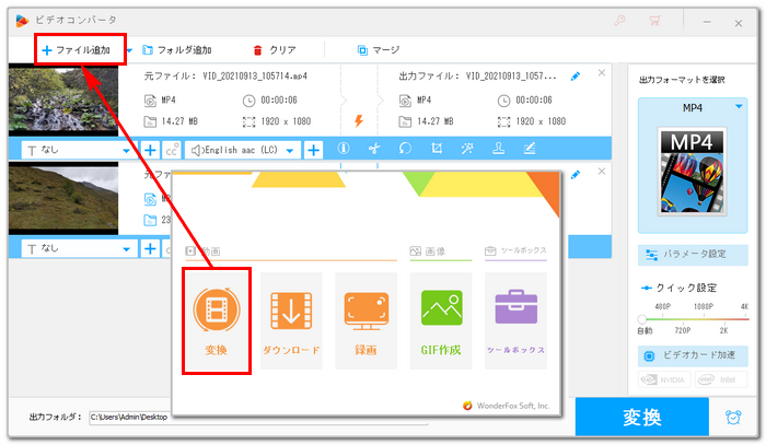 WonderFox HD Video Converter Factory Proを実行し、メイン画面で「変換」機能を選択します。次に「ビデオコンバータ」画面で「ファイル追加」をクリックしてMP3を抽出したい動画ファイルを読み込みます。