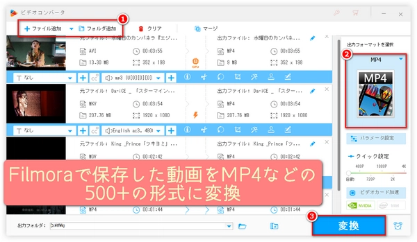 すでにWondershare Filmoraで別の形式で動画を保存した場合、動画形式変換ソフトを使って、Wondershare Filmoraで出力した動画をMP4に変換してみてください。この方法の利点は、Wondershare Filmoraで再度エンコードする必要がないため、より速く、より簡便に、より少ないシステムリソースを消費することです。