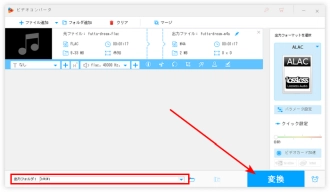 下の「出力フォルダ」欄でファイルの保存先を設定したら、右下の「変換」ボタンをクリックして、WindowsでFLACをALAC(Apple Lossless)に変換します。