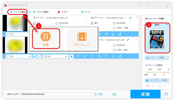 結合したいGIFファイルを「ビデオコンバータ」画面にドラッグ&ドロップして追加します。
