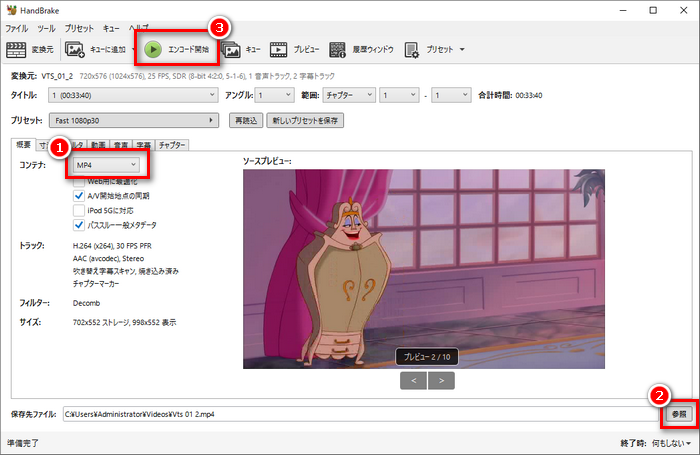 5、「参照」をクリックして保存先を設定してから、「開始」をクリックすればVOBをMP4に変換できます。