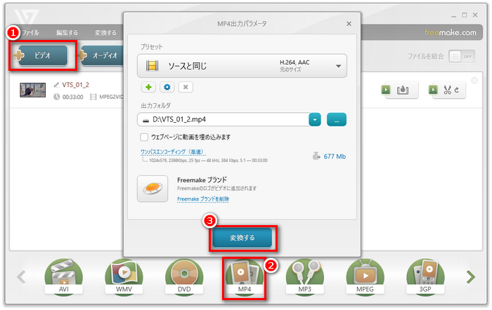 「Freemake Video Converter」はDVD、動画、音楽を変換できるWindows用フリーソフトです。DVD VOBファイル、PCに保存されるVOBファイルをMP4など多くの形式に変換することができます。その他に、動画編集、DVD書き込み、ストリーミングビデオ変換などの機能も付いてます。無料版は変換時間などに制限ないが、変換した動画には透かしが付きます。