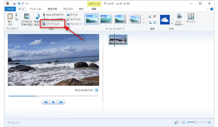 3「ビデオ」>「スナップショットを撮る」をクリックすると動画から静止画を切り出すことができます。